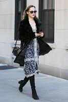 Dakota wearing Barneys New York Suede Brandy Over-the-Knee Boots, Sea Printed Satin-Crepe Dress.